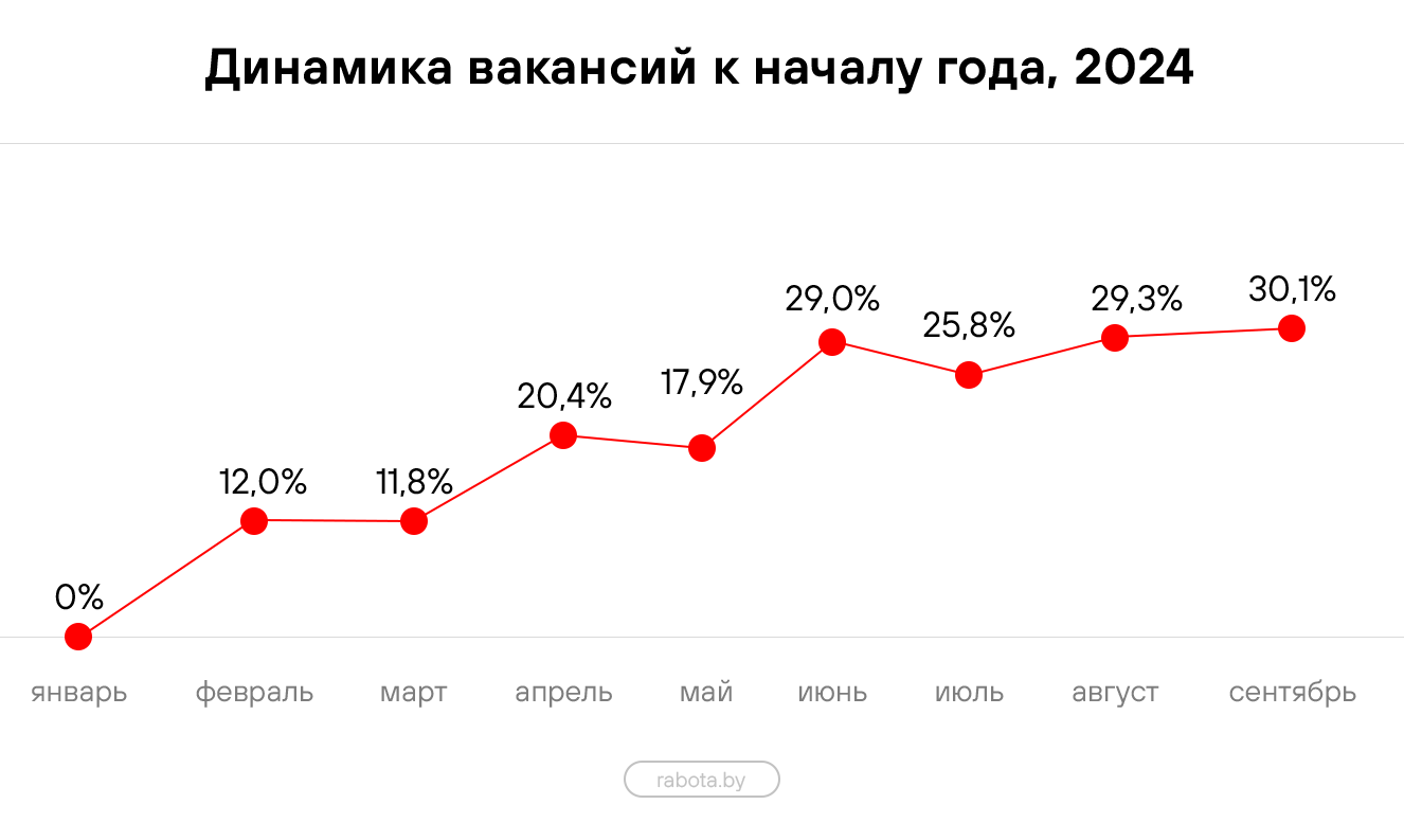 По результатам исследования количество вакансий, размещенных на сайте rabota.by, в сентябре 2024 года выросло на 30,1% по сравнению с началом года.