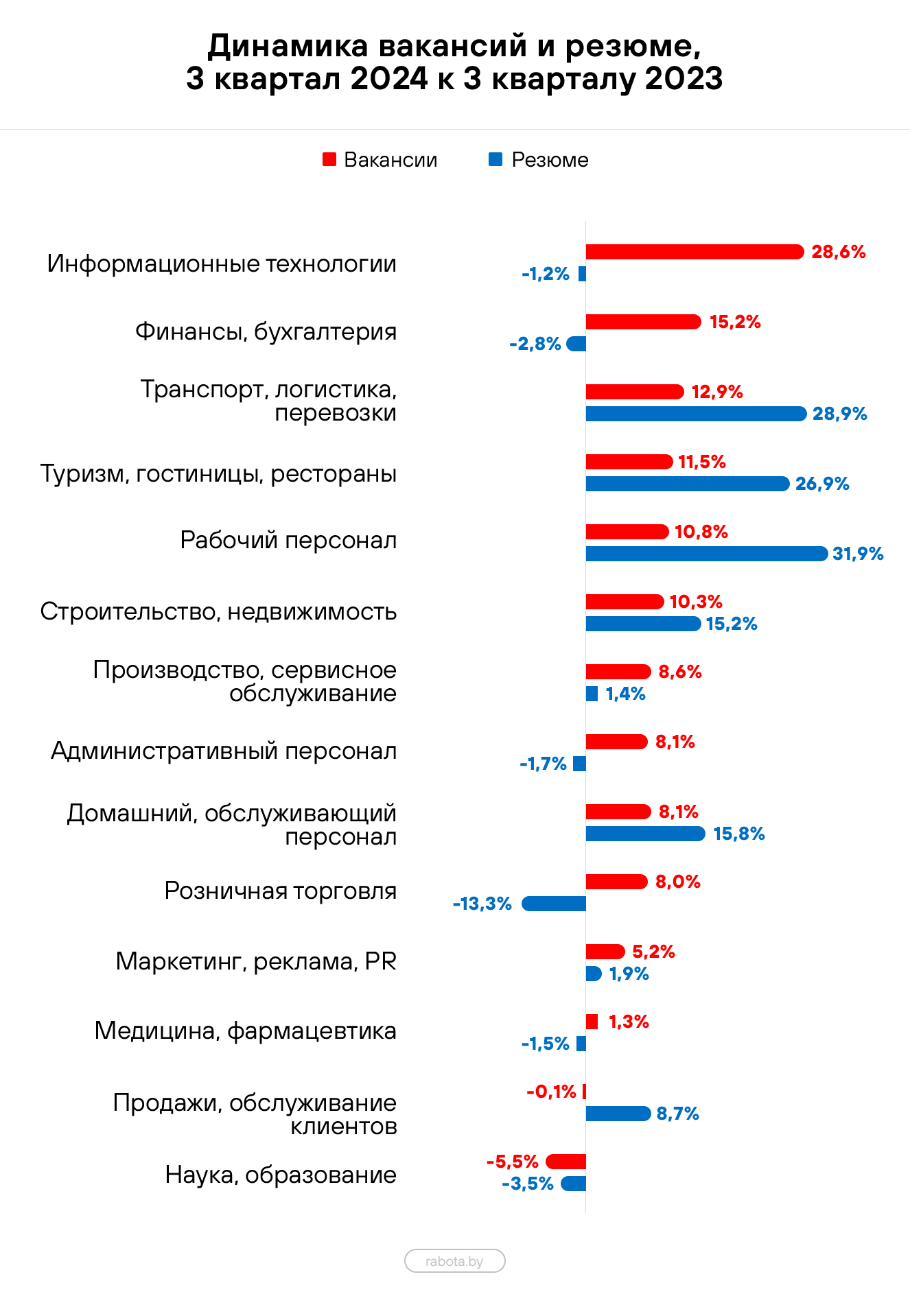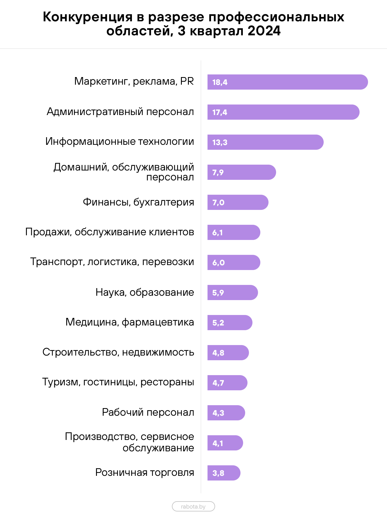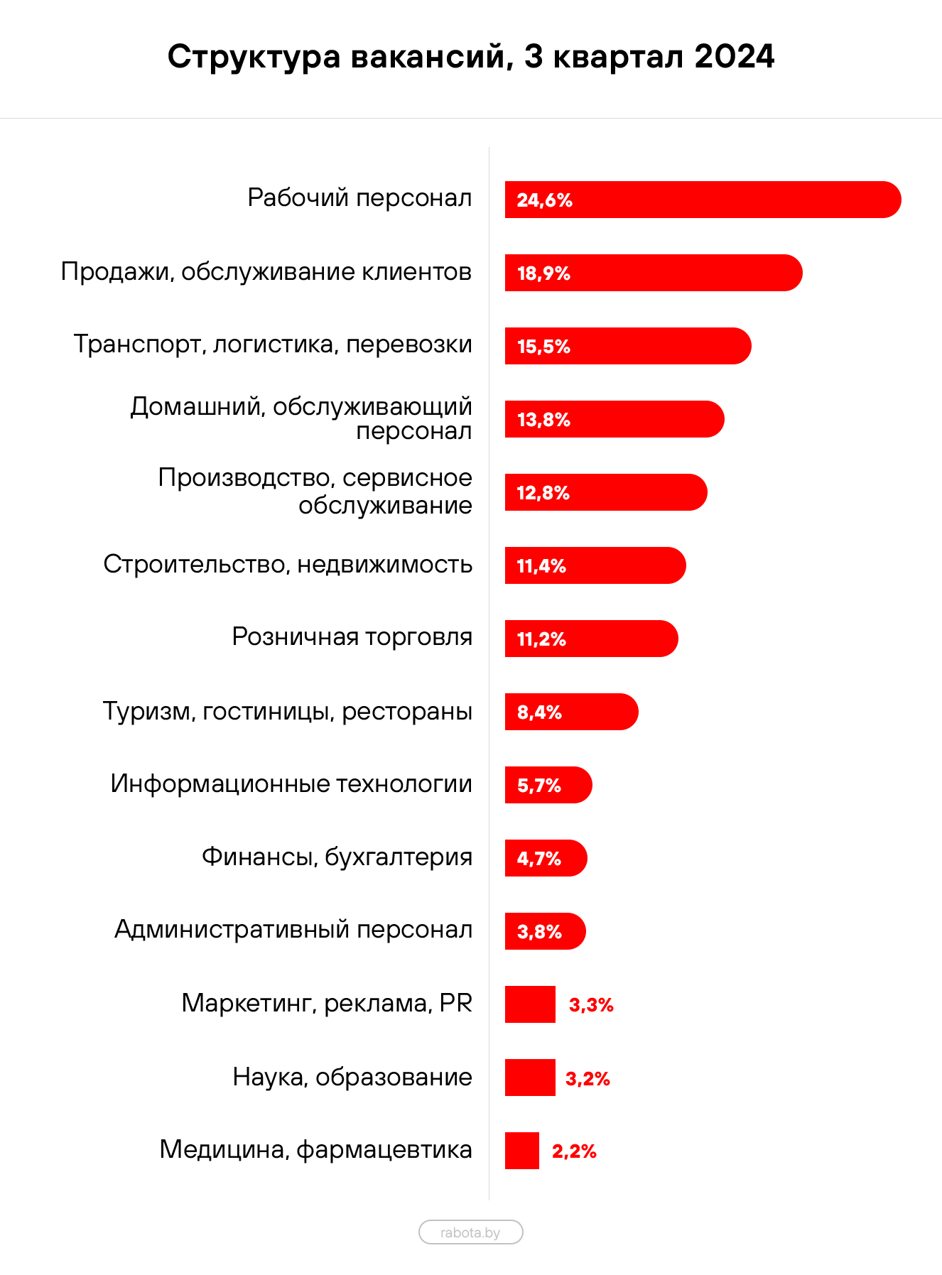 Исследовательский центр rabota.by провел анализ ситуации на рынке труда в 3 квартале 2024 года и выяснил: как изменились спрос и предложение, какие специалисты являются самыми востребованными, какая конкуренция за рабочие места в разных профессиональных областях.