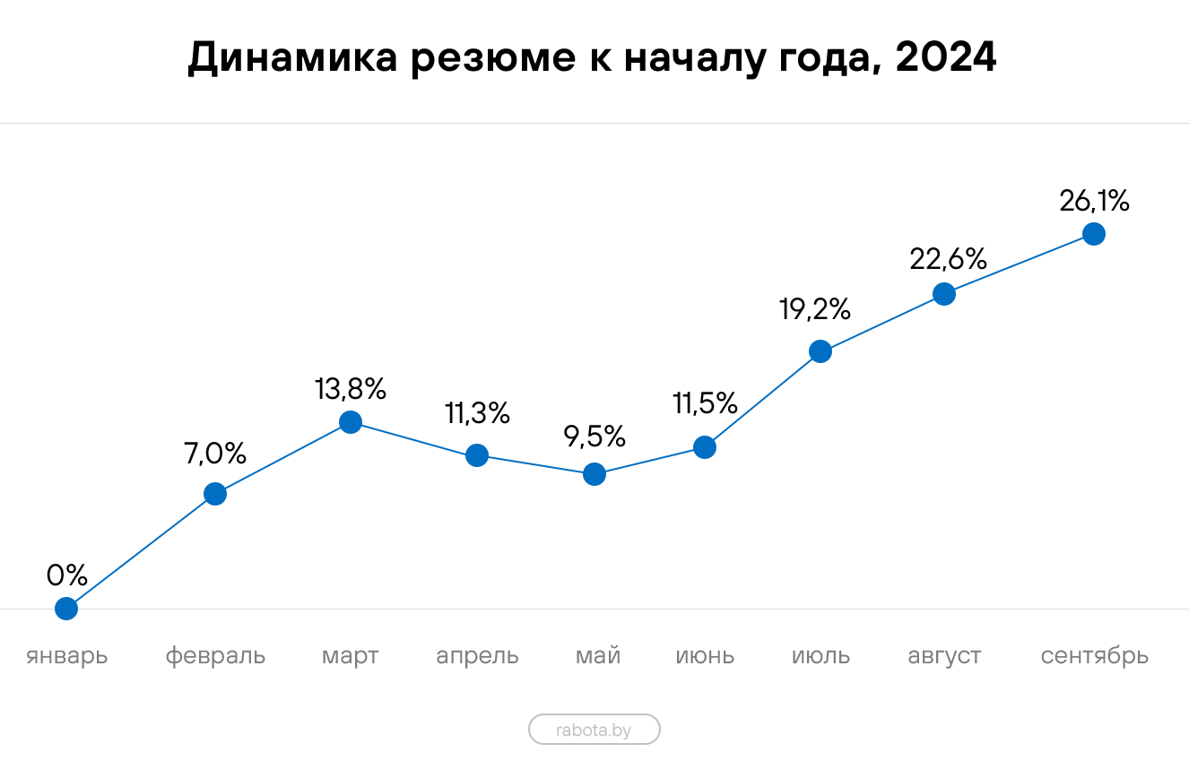 По сравнению с началом года количество резюме, размещенных на сайте rabota.by, в сентябре 2024 года увеличилось на 26,1%. Активность соискателей росла даже в летний период, что нетипично для рынка труда.
