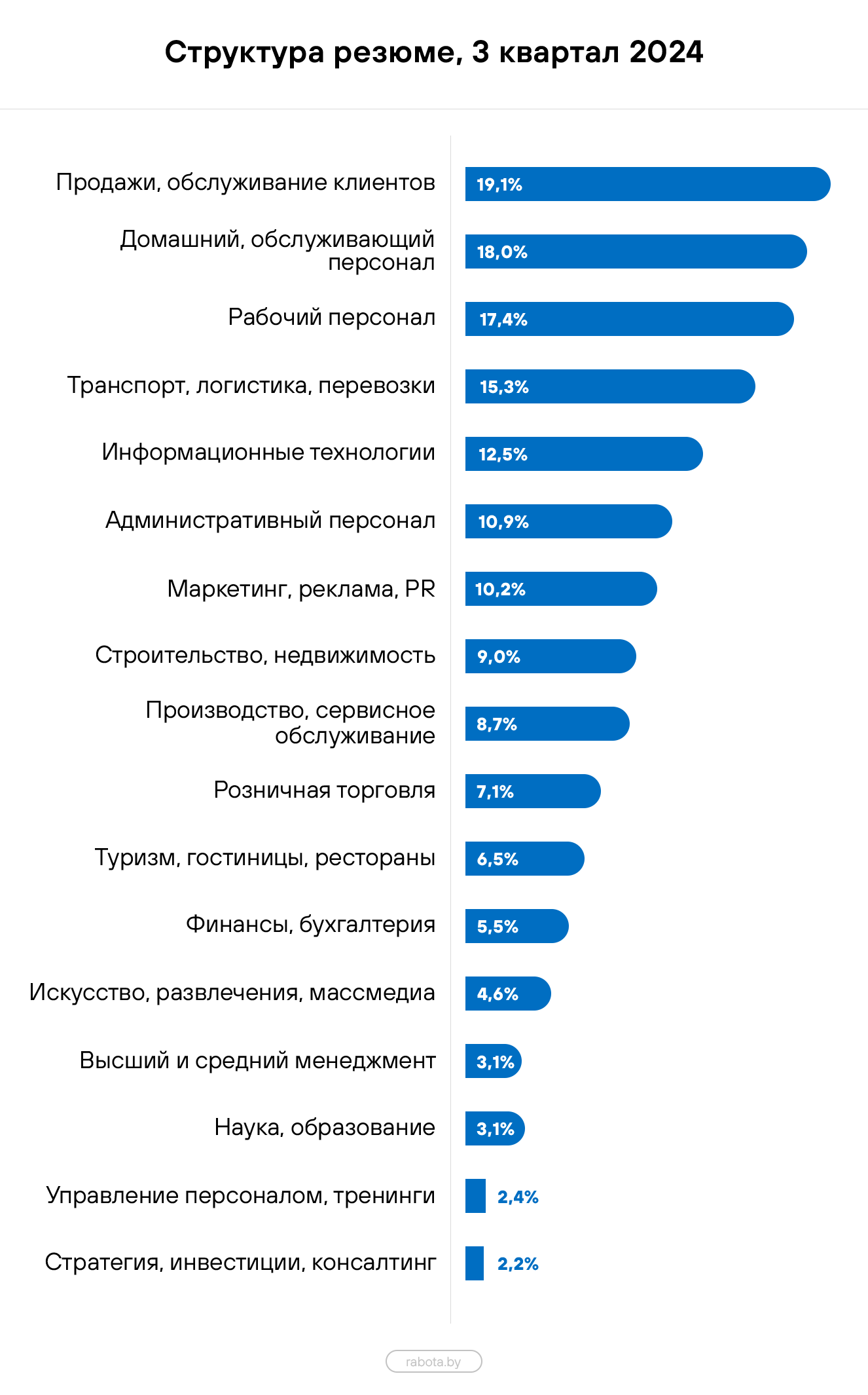 - «Рабочий персонал» (доля в общей базе резюме, размещенных на rabota.by, 17,4%).