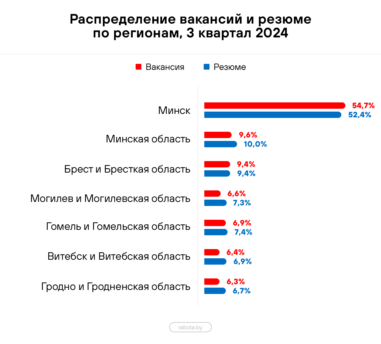 В разрезе регионов наибольшее количество вакансий и резюме размещено в Минске и Минской области. Среди областных центров по количеству вакансий и резюме лидируют Брест и Брестская область. Меньше всего вакансий и резюме размещено в Гродно и Гродненской области.