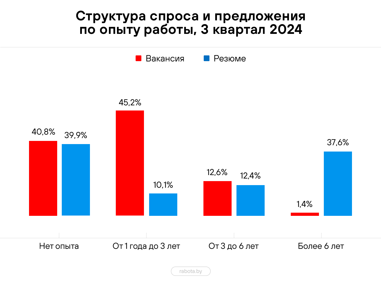 Как и в предыдущие месяцы, в 3 квартале 2024 года были наиболее востребованными специалисты с опытом от 1 до 3 лет (45,2%) и специалисты без опыта (40,8%).
