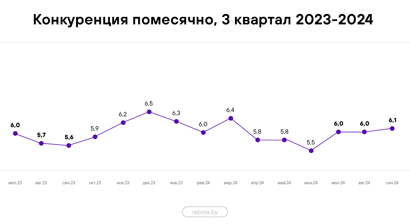 По результатам третьего квартала текущего года конкуренция на рынке труда находится на уровне около 6 резюме на одну вакансию. Если в сентябре 2023 года конкуренция составляла 5,6 резюме на одну вакансию, то в сентябре 2024 года она увеличилась до уровня 6,1 резюме на одну вакансию.