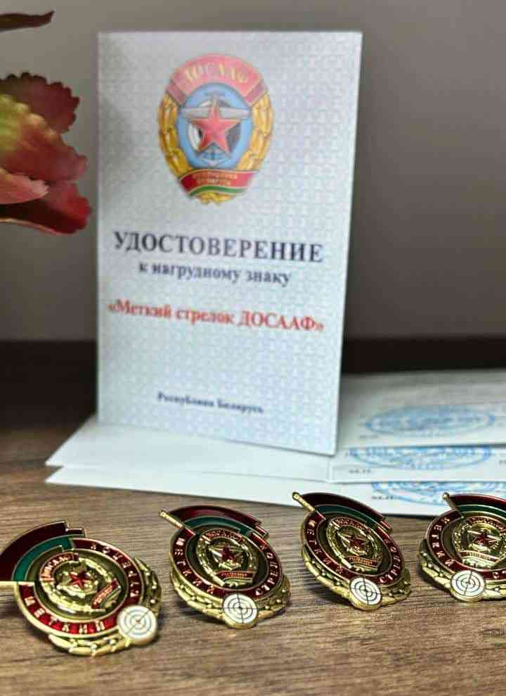 Первое награждение нагрудными знаками «Меткий стрелок ДОСААФ» состоялось еще 5 августа этого года. Тогда, впервые в современной истории Беларуси, обладателями нагрудных знаков стали Кулешова Ольга и Ольшевский Артём, оба работники ОАО «Кобринский маслодельно-сыродельный завод» и представители первичной организации ДОСААФ «Стрелковый клуб «Стрелок». 30 сентября председатель Кобринско-Малоритской МРОС ДОСААФ Сергей Гром вручил знаки отличия еще четырем спортсменам: