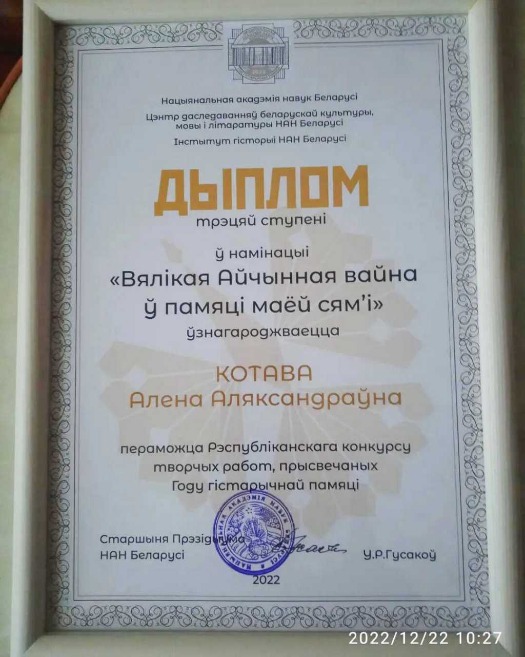 В Минске подведены итоги Республиканского конкурса творческих работ, посвящённых Году исторической памяти. Член литературного клуба «ПоэтиКо», учитель английского языка СШ № 9 г. Кобрина Елена Котова награждена дипломом третьей степени в номинации «Великая Отечественная война в памяти моей семьи».