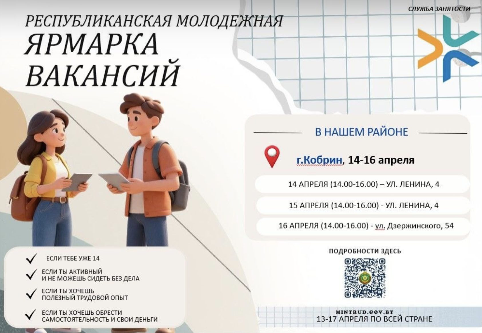 С 14 по 16 апреля 2026 года в Кобрине проводятся молодежные ярмарки вакансий