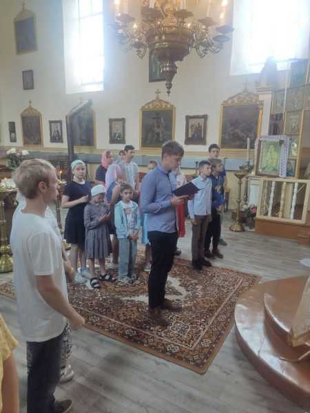 За Богослужением присутствовали участники православного детского лагеря «Ковчег». Дети сами, по очереди, читали молитвы, потом вместе пели.