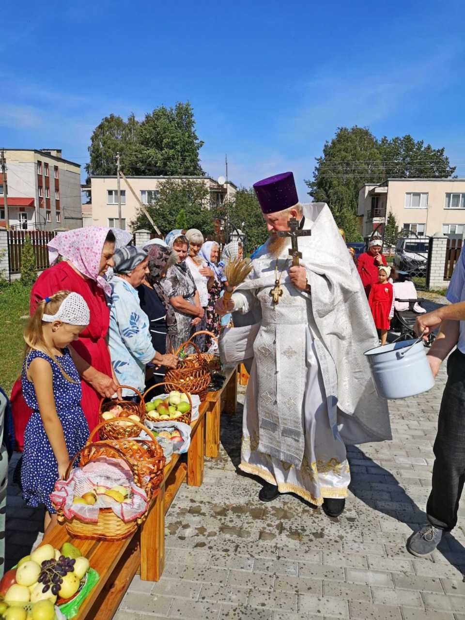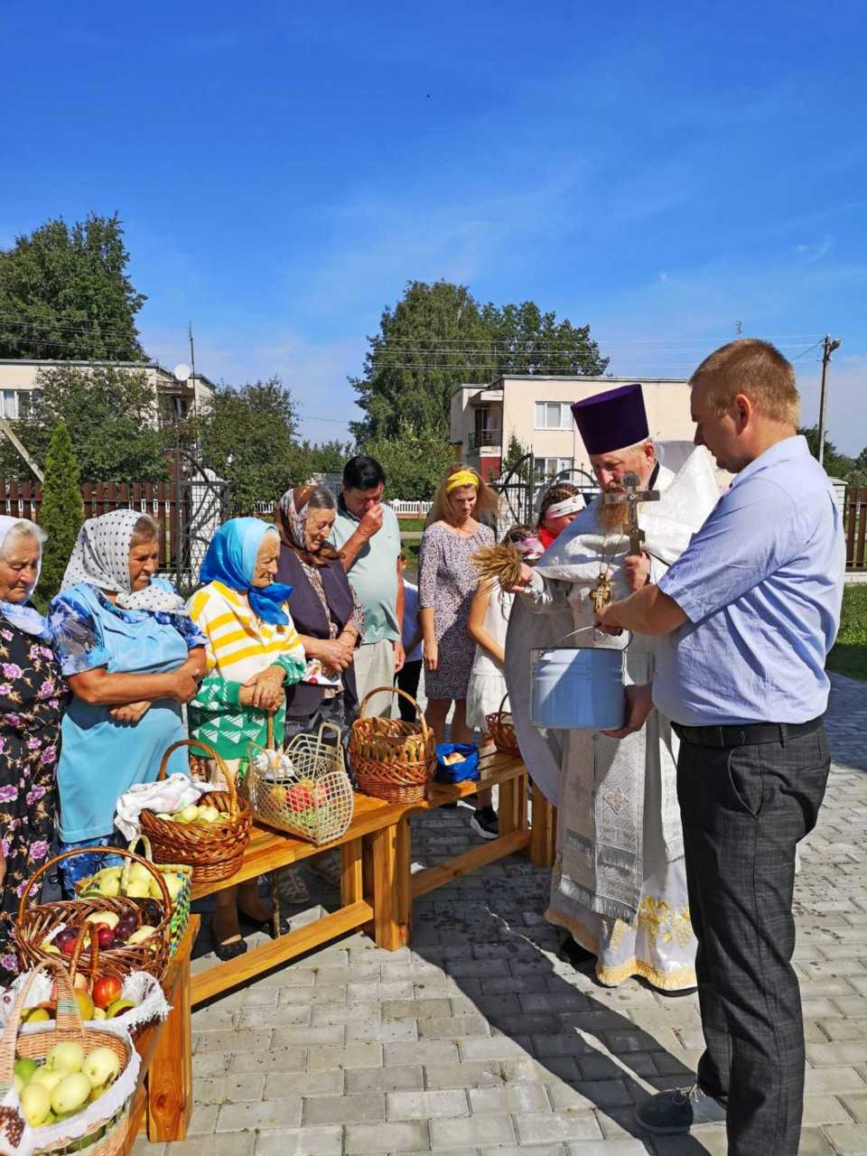 На прихрамовой территории просторно, и после праздничного богослужения множество прихожан собралось у храма, где настоятель храма протоиерей Александр Кондратюк и освятил принесенные плоды.