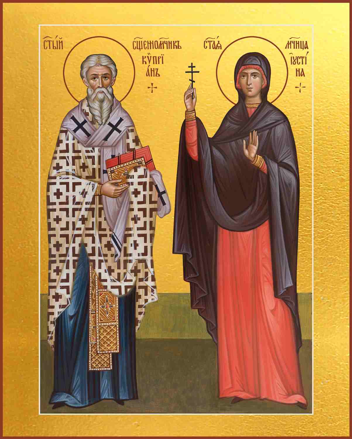 Святые Киприан и Иустина мученически погибли в 304 году. Диавол побудил язычников оклеветать праведников. Правителям сообщили, что христиане смущают народ, ведут его за собой во имя Христа, и это может быть опасно для власти. Киприана и Иустину схватили, посадили в темницу и приказали отказаться от веры, но святые всё претерпевали. Тело Киприана подвесили и медленно строгали плоть. Иустину жестоко избивали. Праведников бросили в котел с кипятком, но вода не жгла их тела. Наконец, назначили казнь усечением мечом. Киприан, боясь, что Иустина увидит его смерь и испугается, попросил время на молитву и дал возможность деве умереть первой. Иустина радостно отправилась на встречу с Небесным Женихом. Вслед за ней последовал к Богу святой Киприан.